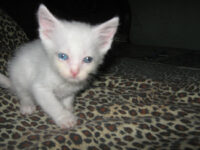 Крошечный белый котенок ищет дом. Котенка нашли в возрасте примерно 2-3 недели. За последнюю неделю он немного подрос, научился кушать и привык к лотку.